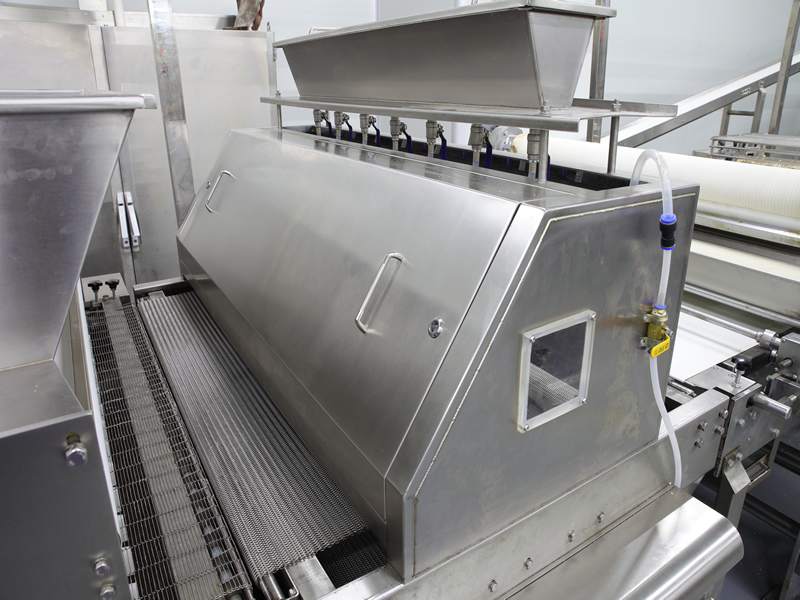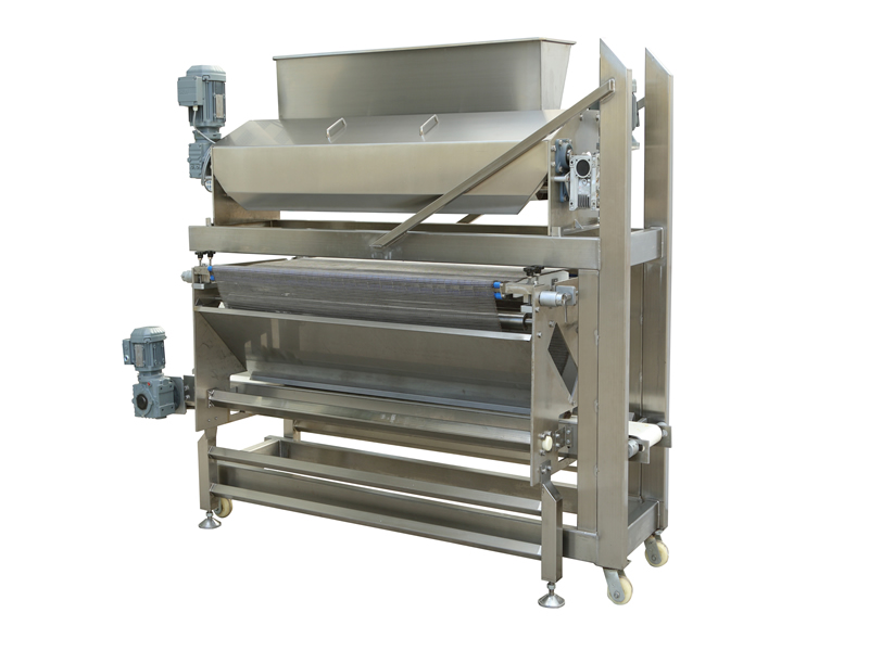 該設(shè)備應(yīng)用于將固體顆粒或者粉狀調(diào)味料,鹽,糖,芝麻及果仁片等撒布在面皮或則餅干上。回收機回收多余的撒布物料循環(huán)利用。